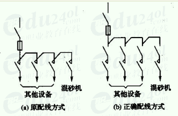 調(diào)查發(fā)現(xiàn),原配電方式的設(shè)計(jì)不符合安全要求,留有嚴(yán)重的隱患。正確配線方式如圖a所示.在分路接觸器的上方應(yīng)裝有分路刀閘開(kāi)關(guān),以便檢修時(shí)隔離電源。電工甲嚴(yán)重缺乏安全意識(shí),即使在原配電方式情況下,如停接觸器后拔下控制回路的保險(xiǎn)(熔斷器),混砂機(jī)也不會(huì)突然起動(dòng)。再者,像這樣的檢修工作,應(yīng)嚴(yán)格執(zhí)行停電制度、監(jiān)護(hù)制度等保證檢修安全的制度。