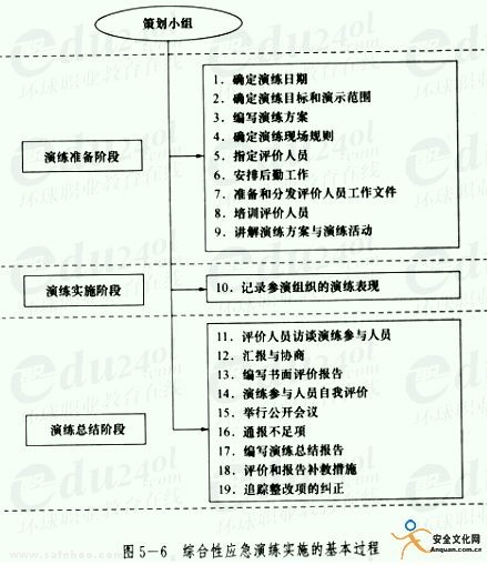 綜合性應急演練的過程可劃分為演練準備、演練實施和演練總結3個階段,各階段的基本任務如圖5—6所示。