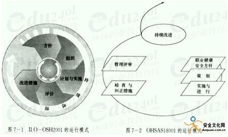 職業(yè)健康安全管理體系,是指為建立職業(yè)健康安全方針和目標以及實現(xiàn)這些目標所制定的一系列相互聯(lián)系或相互作用的要素。它是職業(yè)健康安全管理活動的一種方式,包括影響職業(yè)健康安全績效的重點活動與職責以及績效測量的方法。職業(yè)健康安全管理體系的運行模式可以追溯到一系列的系統(tǒng)思想,最主要的是Edward Deming的PDCA(即策劃、實施、評價、改進)概念。在此概念的基礎上并結(jié)合職業(yè)健康安全管理活動的特點,不同的職業(yè)健康安全管理體系標準提出了基本相似的職業(yè)健康安全管理體系運行模式,其核心都是為生產(chǎn)經(jīng)營單位建立一個動態(tài)循環(huán)的管理過程,以持續(xù)改進的思想指導生產(chǎn)經(jīng)營單位系統(tǒng)地實現(xiàn)其既定的目標。如ILO一OSHl2001的運行模式為方針、組織、計劃與實施、評價、改進措施(圖7—1);OHSASl8001.的運行模式為職業(yè)健康安全方針、策劃、實施與運行、檢查與糾正措施、管理評審(圖7—2)。
