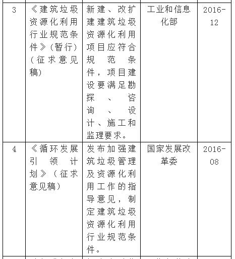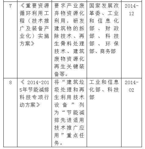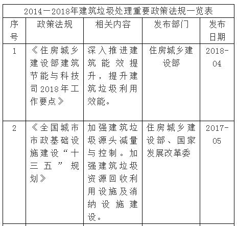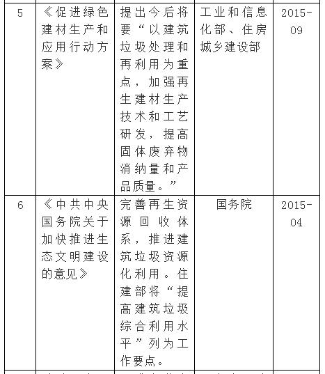 長期以來,由于缺乏統一完善的建筑垃圾管理辦法和良好的產業扶持政策致使建筑垃圾絕大部分未經任何處理便被露天堆放或簡易填埋,如何處理和利用建筑垃圾,已經成為政府所面臨的一個重要難題。為了解決建筑垃圾處理難題,促進建筑垃圾循環利用,國家近幾年頒布了一系列的政策法規,具體政策如下: