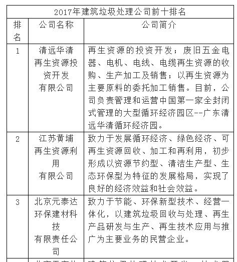根據《中國報告大廳網》匯總信息得知,截至2017年底,通過對建筑垃圾處理行業各項數據統計,建筑垃圾處理公司排名前十的分別是清遠華清、江蘇黃埔、元泰達、天實偉創、上海山美、德濱環保、鼎盛工程、凱興礦山、一帆機械、黎明重工,詳細情況介紹如下: