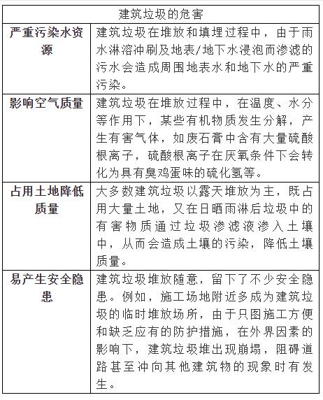 我國絕大部分建筑垃圾未經任何處理便被運往郊外露天堆放或填埋,既占用大量土地,又容易在清運和堆放過程中的遺撒粉塵、灰砂飛揚等問題,進而造成嚴重的環境污染。