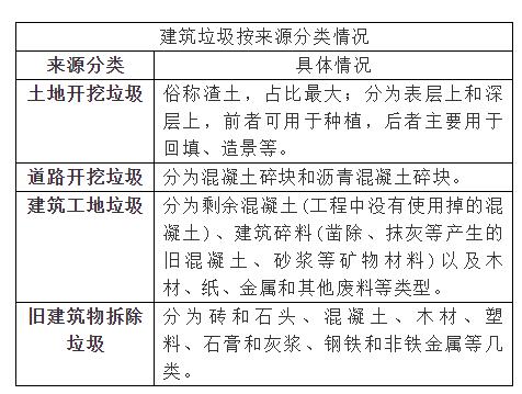 建筑垃圾的產生主要是在建筑施工、裝飾裝修階段與舊建筑的改建中產生的,主要分為土地開挖垃圾、道路開挖垃圾、建筑工地垃圾和舊建筑物拆除垃圾四大類,具體分類如下: