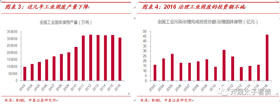除生活垃圾外,工業固廢也是行業重要的處理對象。隨著供給側改革的推進及環保監管趨嚴,環保設施的投入增大,防治工作逐見成效,工業固廢產量近幾年呈降低趨勢,2016年全國工業固廢產量下降至309210萬噸。但產量仍然高于生活垃圾清運量,而且我國工業增加值近幾年保持平穩增速,固廢處理要求不斷提高,工業固廢的投資額不減,2016年同比增長近300%。
