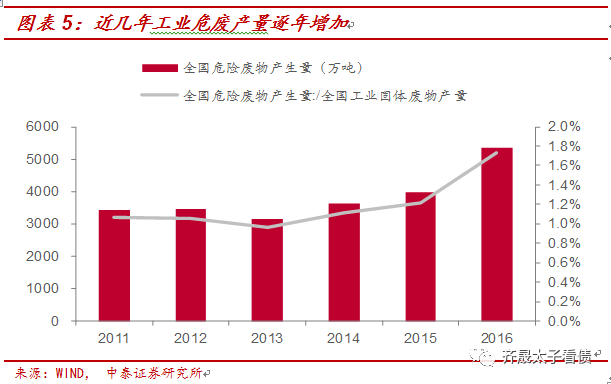 與一般工業固廢處理相比,危廢處理的市場需求不減反增。危廢主要產生于化工、有色行業,未經特殊處理排放會對人類、動植物、環境造成危害。伴隨著生態文明的戰略地位提高,國家對危廢處理行業的建設愈加重視,2016年環保部新增117種危險廢物至《國家危險廢物名錄》,危廢的界定和排放的監管更嚴,偷報漏報情況減少,帶動2016排放量激增34.79%至5347萬噸,在工業固廢中的占比提高至1.73%,行業重要性日漸提高。