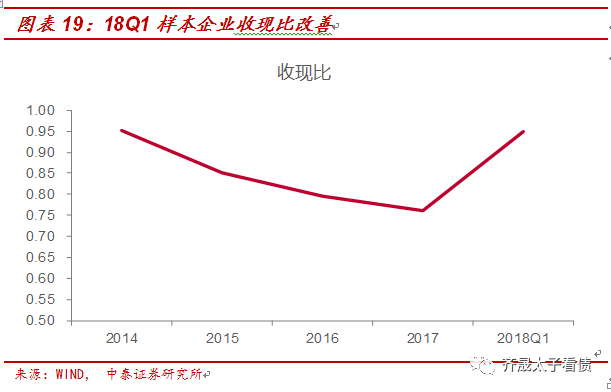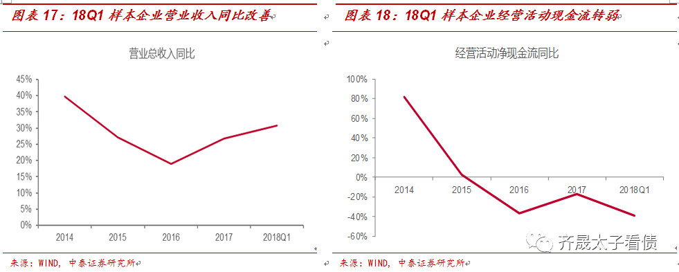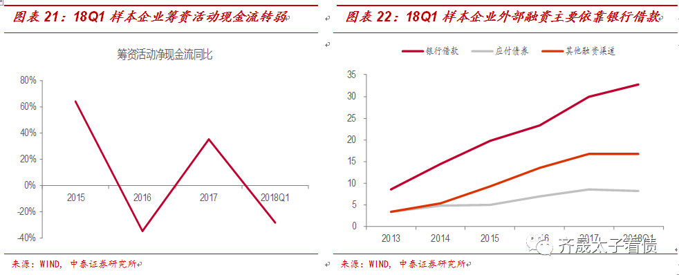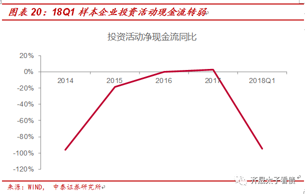外部籌資方面,18Q1企業的籌資活動現金凈流量平均值為1.55億元,但同比增速下降至-28.41%,籌資能力有一定的下降。分現金流的方向看,主要系18Q1籌資活動現金流出速度快于流入速度,企業面臨的再融資壓力增加。