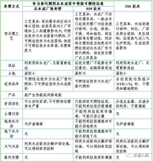 利用新型干法水泥回轉(zhuǎn)窯處理垃圾不同處理方法在各個(gè)環(huán)節(jié)的情況對(duì)比、技術(shù)比較見(jiàn)下表。
