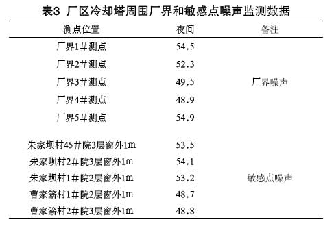 華電半山發電有限公司廠區噪聲綜合治理完畢后,浙江省環境監測中心站對此進行了現場測試,通過了環保驗收。施工單位在冷卻塔周圍廠界和居民住宅處(敏感點)的測試結果見表3。 因夜間噪聲標準比晝間要低10dB(A),夜間噪聲如達標,去掉背景噪聲的影響,晝間應該是達標的,故只進行了夜間的測試。測試結果表明,廠界和居民住宅處(敏感點)的噪聲值均達到GB3096-1993中III類標準的規定,業主和居民都十分滿意。