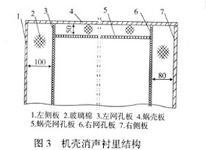 如圖3,在風機機殼內側固定一層穿孔板,其穿孔率約為20%,內襯一種超細玻璃棉,作為吸聲材料,其密度為15~20kg/m3,整個襯墊厚度為50~100mm。可以有效減小音調強度和隨機噪聲。