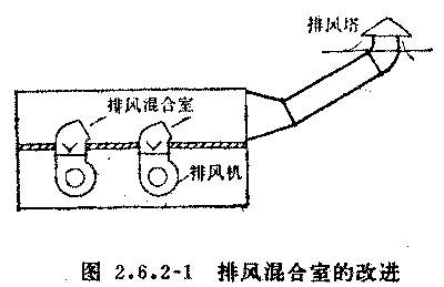 ??? 對(duì)策:合理地選擇風(fēng)道斷面。在每臺(tái)風(fēng)機(jī)出口加裝開(kāi)閉靈活且嚴(yán)密的單流閥。管路盡量減少局部阻力。在排風(fēng)混合室內(nèi)設(shè)一段隔墻,使風(fēng)機(jī)出口處的高速氣流互不干擾而通暢地到達(dá)排風(fēng)塔,且每臺(tái)排風(fēng)機(jī)的出風(fēng)口進(jìn)入混合室時(shí),都加一個(gè)45度彎頭,氣流方向直接對(duì)準(zhǔn)排風(fēng)塔的通道。如圖2.6.2-1。