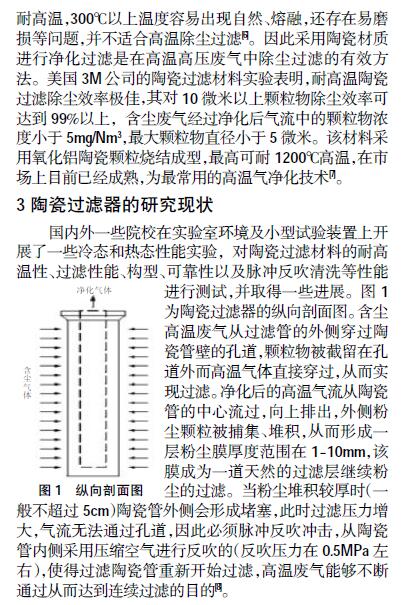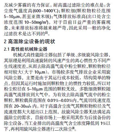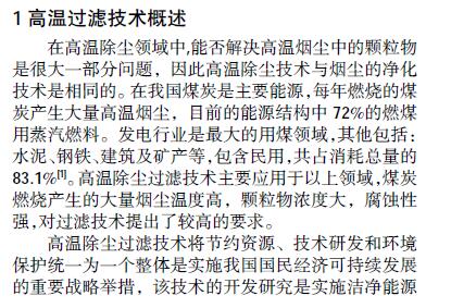 在我國目前的工業能源布局體系中,涉及高溫含塵廢氣領域較多,高溫除塵材料的應用范圍十分廣泛,如煤炭、鋼鐵、水泥等行業。上世紀70 年代左右時間,高溫氣體除塵技術的研究開始發展,最初階段采用除塵方式多為水噴淋濕法除塵,即先將工廠排出的高溫含塵廢氣進行水洗噴淋冷卻,降低廢氣的溫度,水洗進行除塵,顆粒物與水一同排出。這樣既浪費了大量熱能又浪費水資源,造成二次污染。因此為能夠實現對高溫含塵廢氣的綜合利用及粉塵顆粒過濾凈化,必須采用直接除塵過濾的方式,使用過濾介質進行氣固分離。由于在高溫、高濃度、高腐蝕廢氣中工作,因此對過濾材料具有很高的性能要求,過濾介質的材料選擇是其中研發的技術關鍵,這需要采用目前國際上較先進的耐高溫除塵濾料,并必須滿足過濾性、使用壽命、節能環保、市場接受能力等多方面的要求。