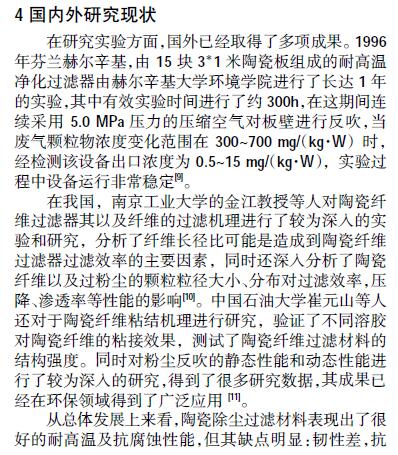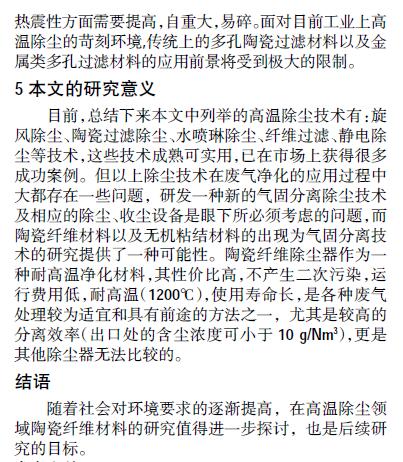 摘要:建材、冶金、電力等行業所排放出來的各類廢氣不僅含有大量的顆粒物并且溫度較高(300度以上),同時對周邊造成污染,是造成目前霧霾多發現象的主要因素之一,但目前國內300度以上的高溫介質過濾式除塵器的工業應用基本還是空白。陶瓷材料具有優良的熱穩定性和化學穩定性,原料來源廣泛,價格低廉,成為開發研制耐高溫濾料的首選材料。但陶瓷過濾材料或是由于材料的抗堵塞性能差,或是由于機械強度低等因素,限制了陶瓷過濾材料在高溫煙氣凈化領域的應用。而陶瓷纖維過濾材料具有高孔隙率、耐腐蝕強、耐高溫、機械強度好等優點。