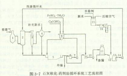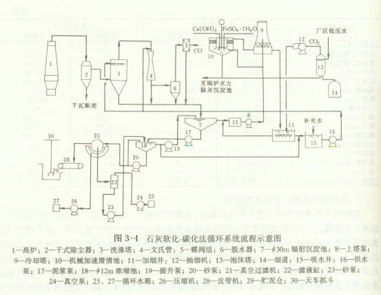 (1)石灰軟化—碳化法工藝流程 洗滌煤氣后的污水經輻射式沉淀池加藥混凝沉淀后,出水的80%送往降溫設備(冷卻塔),其余20%的出水泵往加速澄清池進行軟化,軟化水和冷卻水混合流人加煙井,進行碳化處理,然后泵送回煤氣洗滌設備循環使用。從沉淀池底部排出泥漿,送至濃縮池進行二次濃縮,然后送真空過濾機脫水。濃縮池溢流水回沉淀池,或直接去吸水井供循環使用。瓦斯泥送人貯泥倉,供燒結作原料。工藝流程見圖3-4。