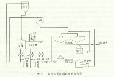 (2)投加藥劑法工藝流程 洗滌煤氣后的廢水經沉淀池進行混凝沉淀,在沉淀池出口的管道上投加阻垢劑,阻止碳酸鈣結垢,同時防止氧化鐵、二氧化硅、氫氧化鋅等結合生成水垢,在使用藥劑時應調節pH值。為了保證水質在一定的濃縮倍數下循環,定期向系統外排污,不斷補充新水,使水質保持穩定。其工藝流程見圖3-5。