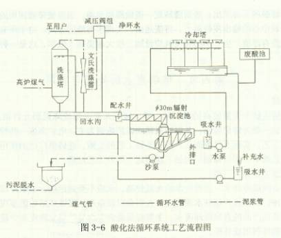 (3)酸化法工藝流程 從煤氣洗滌塔排出的廢水,經輻射式沉淀池自然沉淀(或混凝沉淀),上層清水送至冷卻塔降溫,然后由塔下集水池輸送到循環系統,在輸送管道上設置加酸口,廢酸池內的廢硫酸通過膠管適量均勻地加入水中。沉泥經脫水后,送燒結利用。見圖3-6。