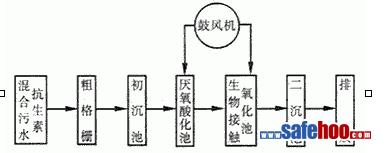 抗生素混合污水流經粗格柵、初沉池后進入厭氧酸化池,通入一定量的空氣,利用厭氧發酵過程的水解酸化段,使水中不溶性的有機物轉化為可溶性的有機物,將難降解的大分子物質轉化為易生物降解的小分子物質,大大提高了污水的可生化性。