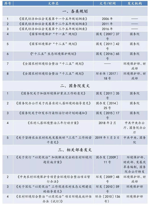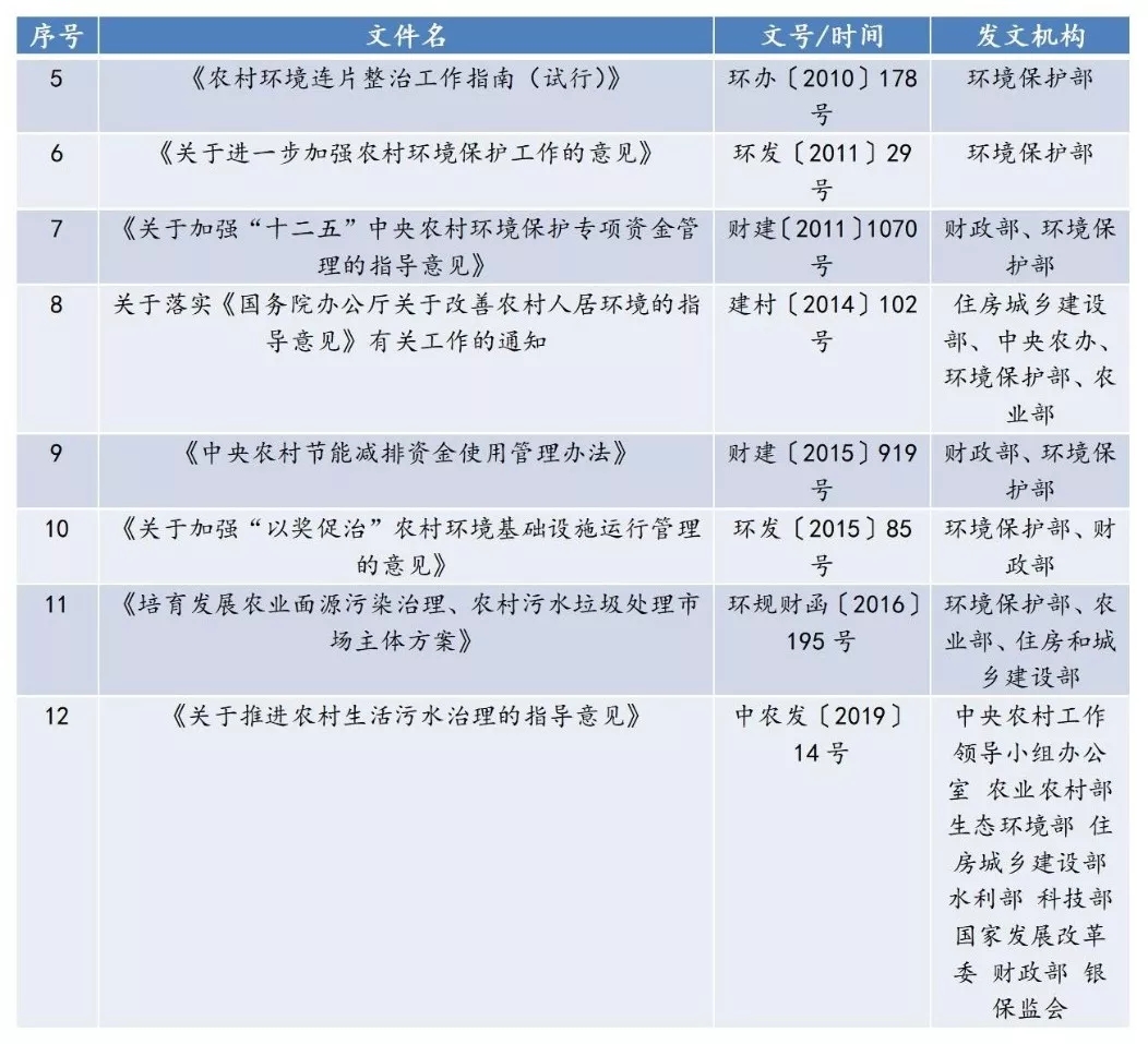自“十一五”起,特別是2008年全國農(nóng)村環(huán)境保護(hù)工作電視電話會議要求“要穩(wěn)步推進(jìn)農(nóng)村環(huán)境綜合整治,實(shí)行“以獎促治”集中整治危害嚴(yán)重的環(huán)境問題,實(shí)行“以獎代補(bǔ)”鼓勵開展生態(tài)示范創(chuàng)建,建設(shè)清潔家園。綜合整治一定要從實(shí)際出發(fā),尊重農(nóng)民意愿,務(wù)求實(shí)效”以來,國務(wù)院、相關(guān)部委以及各省市對農(nóng)村環(huán)境整治越來越重視,相繼出臺了一系列的文件支持對農(nóng)村環(huán)境的治理,其中包括了對農(nóng)村污水的治理要求,本文僅就中央政府及各部位發(fā)布的比較重要的文件詳列如下。