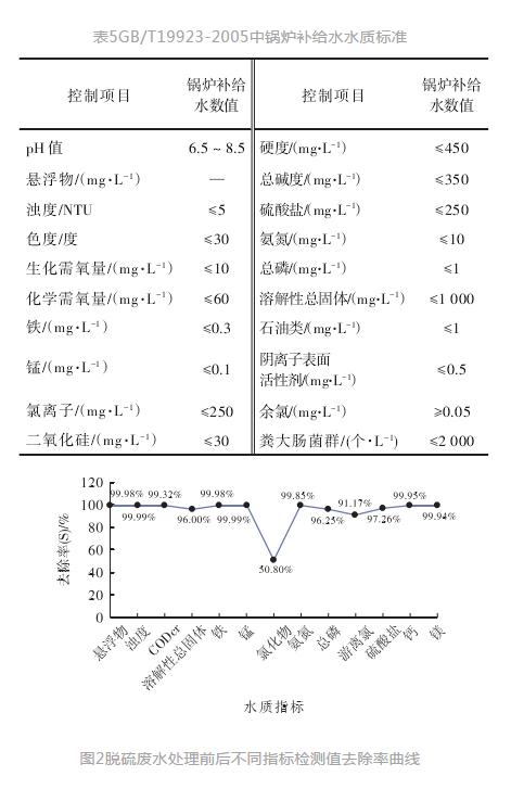 摘要:火電廠濕法脫硫廢水零排放已成為大家關注的重點問題。通過分析某電廠脫硫廢水水質特性,提出了一種低溫煙氣余熱閃蒸脫硫廢水深度處理技術,并進行了15m3/h的工程化處理示范。運行結果表明,該工藝系統結構簡單,運行穩定可靠,凝結水回收率高,無廢水排放,達到了脫硫廢水零排放的目的。無需加藥預處理,利用廢水中的石膏作為晶種,實現廢水濃縮過程中二價鹽結晶分離。系統運行費用低,每處理1m3脫硫廢水直接運行成本約為19.42元。從原水與凝結水水質指標對比可以看出,除氨氮外,凝結水中懸浮物(SS)、化學需氧量、鈣離子、鎂離子、硫酸根離子、氯離子等主要指標的去除率均高于96%,主要指標基本達到了GB/T19923—2005《城市污水再生利用工業用水水質》中鍋爐補給水水質標準要求。