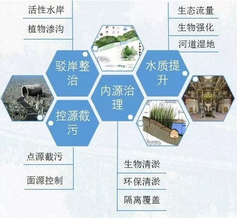 系統治理要從控源截污、內源治理、駁岸整治、水質提升四大方面進行技術措施配置。
