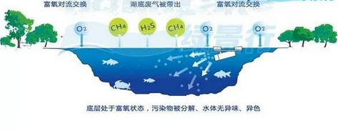(1)曝氣造流技術:通過水流循環一方面把微小的氣泡分散到水體各處以達到提高溶解氧濃度,同時消除水溫分層現象并置換出底層的臭氣,促進好氧降解、抑制藻類、提高透明度。