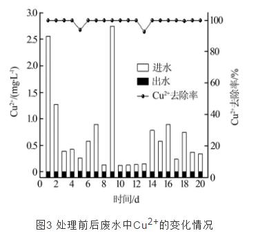 圖2~圖4分別為含鎳電鍍廢水處理前后廢水中Ni2+、Cu2+及總Cr的變化情況。