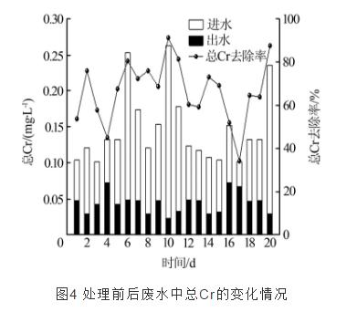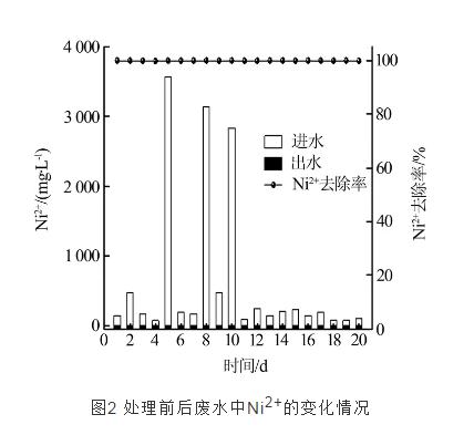 由圖 5可知,進水COD為27~82 mg/L,經處理后,出水COD為10~23 mg/L,低于GB 21900—2008表3的標準。長時間運行、取樣及檢測結果顯示,含鎳電鍍廢水在流量為1.2 m3/h的條件下,出水COD能保持穩定狀態,說明該系統對COD有較好的處理效果。