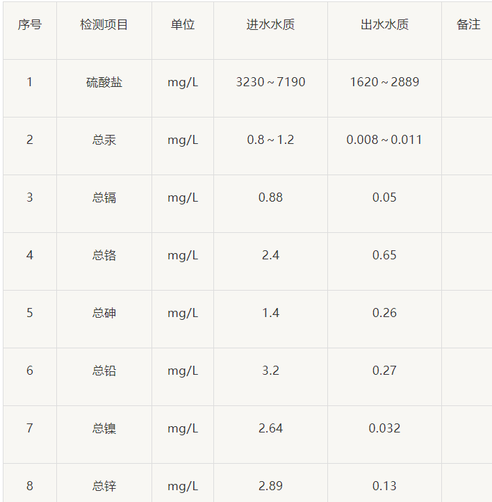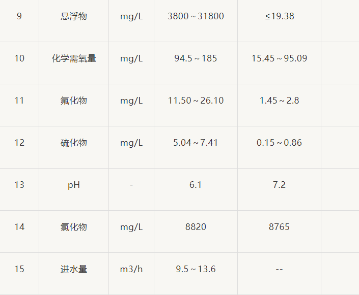 2016年7月,在湖南某發電公司新建一套DBS/DM一體化脫硫廢水處理系統,處理能力10~15m3/h。新配制一根進水管道,直接將脫硫廢水引入DM一體化處理系統,新型高分子DBS水處理藥劑預先加入DM一體化系統自帶的加藥箱貯存,利用變頻電機控制加藥閥的旋轉快慢,實現控制加藥速度與加藥量。在DM一體化系統反應區中將DBS藥劑與脫硫廢水均勻混合,完成pH稍微調整、螯合脫除重金屬、絮凝懸浮物、去除部分COD、硫化物、氟化物的過程,出水溢流進入清水緩沖箱,并對pH、濁度、重金屬及其他污染物成份定期抽樣檢測,其進出口水質情況如下表1所示。然后清水通過泵送往后續的濃縮除鹽系統,進行零排放處理。DM一體化系統分離出來的污泥定期間歇自動排往污泥收集池,通過泵送往壓濾機脫水后,泥餅單獨進行無害化處置。