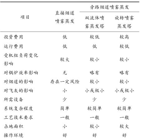 雙流體噴槍霧化脫硫廢水,脫硫廢水宜經過預處理(如軟化等)。旋轉霧化器可直接對懸浮物濃度小于 25% 的廢水進行霧化,適用范圍廣。綜上,各技術(不含廢水預處理)比較見表 1。