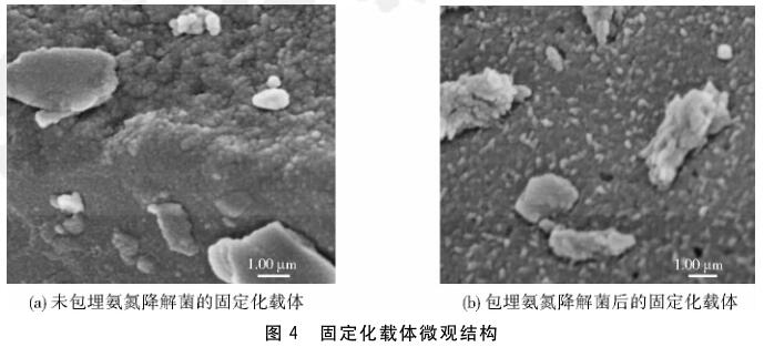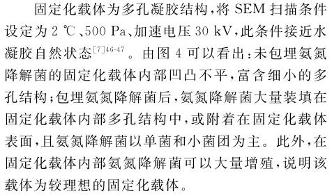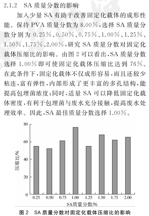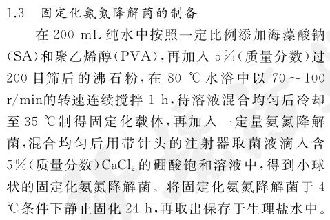 考察了海藻酸鈉(SA)和聚乙烯醇(PVA)含量對固定化載體性能的影響,并篩選了最優(yōu)條件制備固定化氨氮降解菌,研究其對氨氮廢水的處理效果.當(dāng)PVA和SA質(zhì)量分數(shù)分別為8.00%、1.00%時,制成的固定化載體抗壓性能最好,能夠形成豐富的多孔結(jié)構(gòu).
