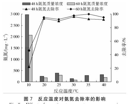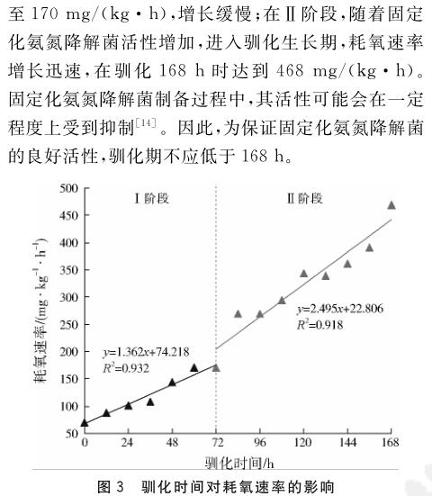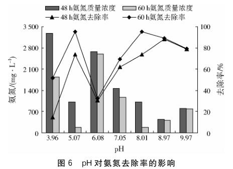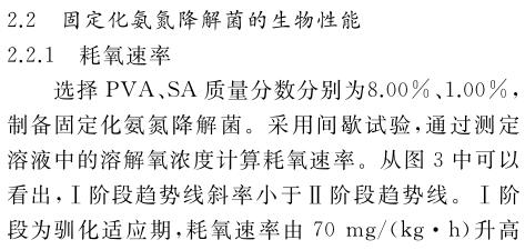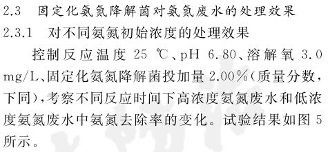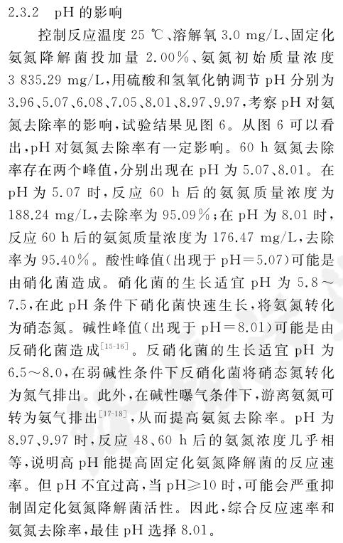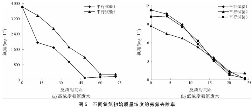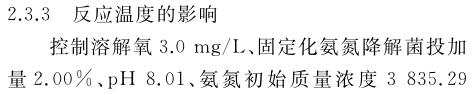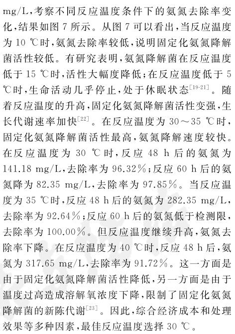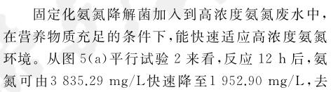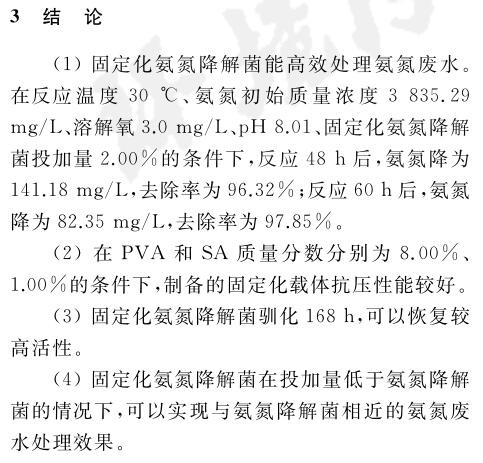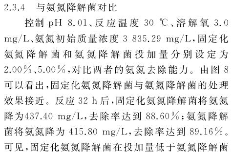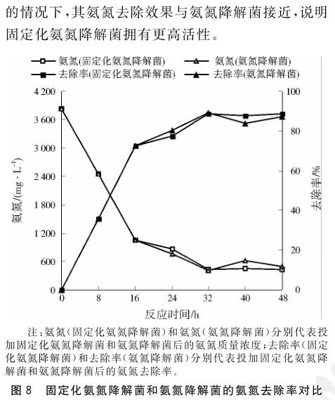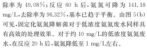 固定化氨氮降解菌在處理氨氮廢水前馴化168 h,可以恢復(fù)較高活性.在固定化氨氮降解菌投加量2%(質(zhì)量分數(shù))、反應(yīng)溫度30 ℃、pH 8.01、溶解氧3.0 mg/L的條件下反應(yīng)60 h,氨氮廢水中的氨氮質(zhì)量濃度從最初的3835.29 mg/L降為82.35 mg/L,去除率為97.85%.固定化氨氮降解菌在投加量低于氨氮降解菌的情況下,仍然能實現(xiàn)與之相近的氨氮廢水處理效果,證明固定化氨氮降解菌能高效處理高濃度氨氮廢水.