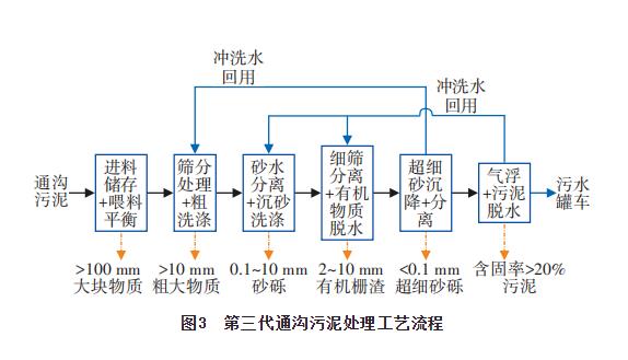 ② 不同城市通溝污泥的性質差別很大,同時污泥性質還受到管網類型與用地類型的影響。濕式多級分離處理工藝對通溝污泥性質變化適應性強,還可兼顧污泥的資源化利用。鑒于“節水即治污”的理念,堅持節水優先的政策,對于水資源敏感地區,可采用沖洗水全回用的通溝污泥處理工藝。該工藝可實現約100%沖洗水回用,有利于大幅降低尾水排放量,提高通溝污泥資源化利用率。該工藝可采用移動式通溝污泥處理站形式,解決通溝污泥處理點分散的問題。