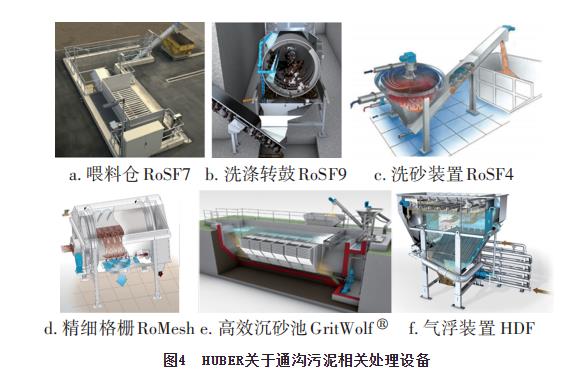 對于移動式通溝污泥處理站,需要統籌考慮其沖洗水來源、尾水排放、篩分物處理、占地等因素。針對上述考慮,HUBER推出一種緊湊式的沖洗水全回用的通溝污泥處理工藝,即第三代通溝污泥處理工藝,其流程見圖3,相關設備見圖4。