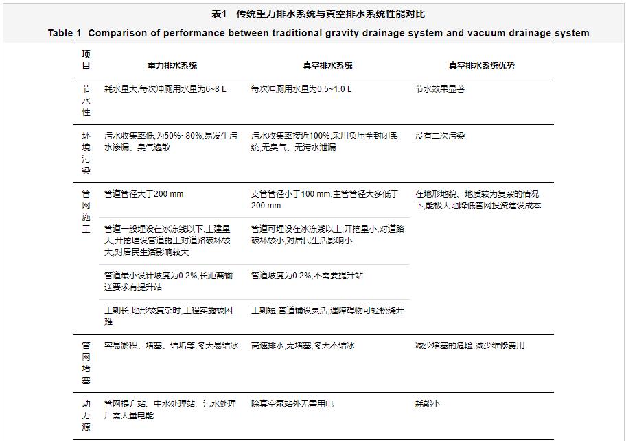 與傳統(tǒng)重力排水系統(tǒng)相比,真空排水系統(tǒng)具有節(jié)水、隔臭、無(wú)滲漏、收集率高、密閉性好等優(yōu)點(diǎn),排水管道具有管徑小、埋深淺、能爬坡、防凍防堵、管道鋪設(shè)靈活,不需要設(shè)置檢查井,受外部環(huán)境限制程度低,不影響周?chē)h(huán)境,施工方便快捷、周期短、土建費(fèi)用低等特點(diǎn)[3,9-10](表1)。