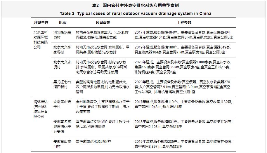 經(jīng)過(guò)近20年的探索與實(shí)踐,國(guó)內(nèi)在室外真空排水系統(tǒng)應(yīng)用方面形成了一批具有核心技術(shù)裝備的環(huán)保企業(yè),如萬(wàn)若(北京)環(huán)境工程技術(shù)有限公司、湖南真創(chuàng)環(huán)保科技有限公司、北京國(guó)科綠源環(huán)境科技有限公司、山東中車(chē)華騰環(huán)保科技有限公司、清環(huán)拓達(dá)(蘇州)環(huán)境科技有限公司等,其在國(guó)內(nèi)自主研發(fā)真空排水技術(shù)及設(shè)備方面處于領(lǐng)跑地位,并在我國(guó)農(nóng)村生活污水治理中開(kāi)展了大量的工程應(yīng)用。2004年,國(guó)內(nèi)首次將室外真空排水系統(tǒng)應(yīng)用于上海國(guó)際賽車(chē)場(chǎng)廁所污水收集項(xiàng)目中[26],后續(xù)逐步應(yīng)用至別墅區(qū)、景區(qū)[27];從2014年開(kāi)始,真空排水系統(tǒng)逐步在農(nóng)村生活污水治理項(xiàng)目中得到大規(guī)模應(yīng)用,主要分布在江蘇、浙江、安徽、天津、北京、黑龍江等省(市)(表2)。其中,我國(guó)規(guī)模最大的農(nóng)村真空負(fù)壓排水集中處理系統(tǒng)工程位于天津?qū)幒訁^(qū)七里海保護(hù)區(qū),該工程于2020年開(kāi)始建設(shè),惠及造甲鎮(zhèn)、東棘坨鎮(zhèn)、俵口鎮(zhèn)、廉莊鎮(zhèn)4個(gè)鎮(zhèn)27個(gè)村共14 115戶村民。