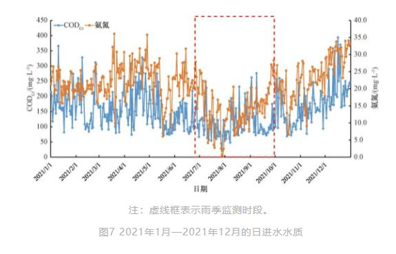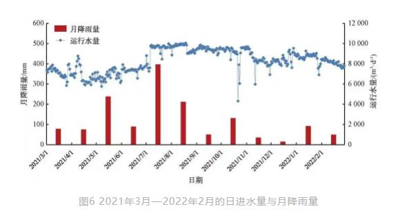 葛塘河凈水站自2020年下半年開始逐步進入調試運行期,近一年運行進水量和進水水質如圖6和圖7所示,自2021年下半年開始,進水量穩步提升,日運行水量在8 000~10 000 m3/d,且雨季明顯高于旱季。從進水水質情況來看,旱季進水平均CODCr質量濃度在200 mg/L左右、平均氨氮質量濃度在20 mg/L左右,而雨季進水平均CODCr質量濃度在120 mg/L左右、平均氨氮質量濃度在14 mg/L左右。水量和進水水質數據說明,片區管網有待于進一步修復完善。