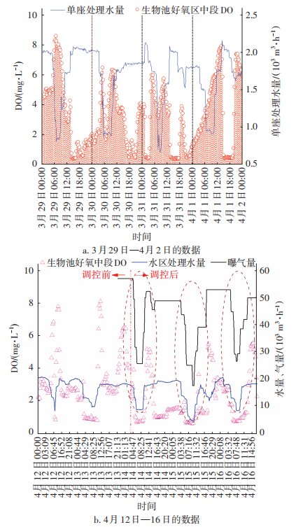 鼓風機調控前,由于風量調節難以適應水量變化,導致低水量期氣量與能源浪費,而高水量期則氣量供應不足。生物池處理水量、曝氣量與DO變化情況見圖3。