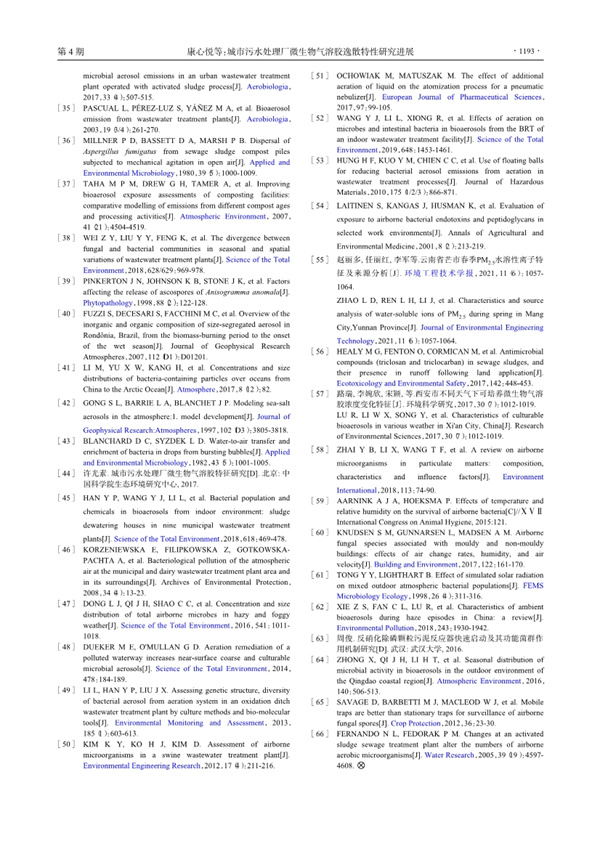 城市污水處理廠在改善城市水環境方面發揮著重要作用,“十二五”至“十三五”期間,我國城鎮污水處理能力從2013年的1.48億m3/d升至2020年的2.68億m3/d。城市污水處理廠匯集了來自于污水以及污水處理過程中產生的大量微生物,是微生物氣溶膠逸散的重要點源之一。污水或污泥中的微生物在能夠造成水面擾動和水滴噴濺的機械作用下逸散至空氣中,形成微生物氣溶膠。城市污水處理廠周圍空氣環境中除含有常見的細菌、真菌外,還可能含有某些致病微生物,其能夠通過呼吸和接觸等方式侵入機體。Rylander等報道了城市污水處理廠工作人員經常出現的諸如急性鼻炎、發燒,有時還伴有皮膚病、腹瀉和一些其他暫時性腸胃反應等癥狀的特殊疾病,稱為“污水工作者綜合征(sewage worker's syndrome)”,長期在污水處理環境工作還可能引起不可逆的呼吸系統疾病和慢性肺功能衰退。隨著城市的不斷擴張,曾經地處遠郊的城市污水處理廠周邊地區逐漸發展為新城區,城市污水處理廠逸散至空氣中的微生物氣溶膠對周邊環境和人體健康的影響越來越受到人們的重視。