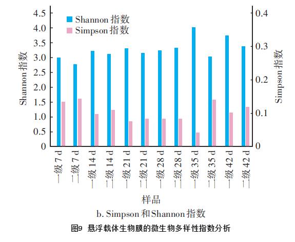 以Chao和Ace指數表征樣品物種的豐富度,指數值越大,說明該樣本物種數越多。如圖9(a)所示,整個研究階段,生物膜的Chao和Ace指數均無明顯變化趨勢,但除第21天外,其他時間一級生物膜的Chao和Ace指數均高于同期二級生物膜。可見,系統在啟動初期生物膜的物種豐富度就達到了較高水平,但受進水負荷的影響,一級生物膜優先發揮污染物去除作用,致使其物種豐富度高于二級生物膜。