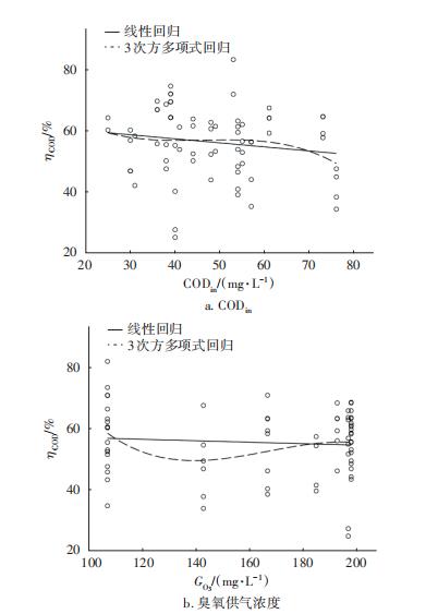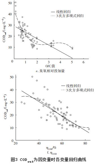 首先把35次試驗(yàn)中每次試驗(yàn)的二次取樣測(cè)定結(jié)果作為70例“個(gè)案”,變量包括CODin、HRT、GO3、LO3、O/C;因變量包括去除率ηCOD和出水濃度CODout。當(dāng)然,這些變量中有的不是獨(dú)立變量,有的對(duì)試驗(yàn)結(jié)果影響不大。首先,以ηCOD為因變量,對(duì)上述6個(gè)因素進(jìn)行回歸分析,結(jié)果如圖2所示。