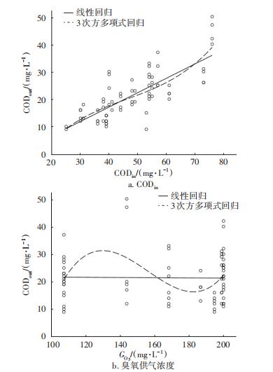 CODin:試驗(yàn)點(diǎn)非常分散;不僅如此,線(xiàn)性回歸和3次方多項(xiàng)式回歸基本水平(略向下),由此可見(jiàn)進(jìn)水CODin對(duì)處理效果影響的規(guī)律性不強(qiáng)。