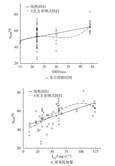 從表2很難定量把握催化臭氧氧化反應(yīng)的整體規(guī)律,這不僅是由于每次試驗(yàn)取樣和測(cè)試分析存在誤差,更為重要的是氧化反應(yīng)為多因素作用。通過(guò)運(yùn)用相關(guān)統(tǒng)計(jì)軟件進(jìn)行多因素回歸分析,能較容易地找出各工況參數(shù)對(duì)工藝效果的影響。