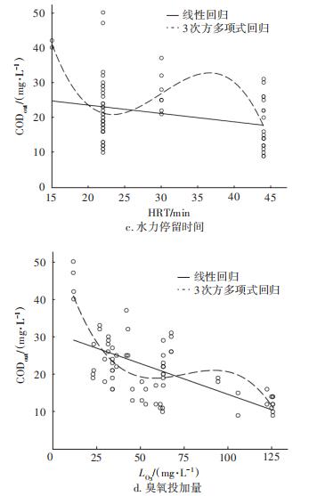HRT:同樣,由于水泵運(yùn)行和操作習(xí)慣,水力停留時(shí)間HRT也只能保持?jǐn)?shù)個(gè)工況,中試共有4 個(gè)工況,分別是15、22、30、44 min,其中以22min工況試驗(yàn)次數(shù)最多。從圖2(c)可見(jiàn),隨著HRT的增長(zhǎng),ηCOD明顯提高;還應(yīng)注意,當(dāng)停留時(shí)間為15min時(shí),ηCOD均低于50%。LO3:該參數(shù)對(duì)ηCOD有明顯的影響,特別是低濃度段,隨著濃度的升高,去除率增加明顯。O/C:該變量反映的是反應(yīng)物當(dāng)量,應(yīng)成為工程設(shè)計(jì)和運(yùn)行控制中的重要參數(shù)。從圖2(e)可以看出,在比值較小階段,隨著O/C值的上升,對(duì)ηCOD的作用很大,但大于2后去除率實(shí)測(cè)值基本不再升高。靠近ηCOD最大值時(shí),實(shí)測(cè)O/C值為1.96。CODout:該變量與ηCOD的線(xiàn)性關(guān)系很好,說(shuō)明兩者是相關(guān)的因變量。中試的目標(biāo)是使出水COD濃度保持在30mg/L以下,當(dāng)以CODout為因變量時(shí),考察各因素的影響,結(jié)果如圖3所示。