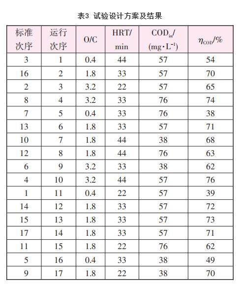 從圖4可以發(fā)現(xiàn),第12次“運(yùn)行”為實(shí)際最優(yōu)值,當(dāng)O/C值為1.8、HRT為33min、CODin為57mg/L時(shí),ηCOD達(dá)到72% 。從圖4還可以發(fā)現(xiàn),當(dāng)O/C值大于1.2時(shí),可以保證ηCOD在60%以上;但要達(dá)到更高的去除率,O/C要增加很多,且逐漸趨于極限,因此工程上是不經(jīng)濟(jì)的。