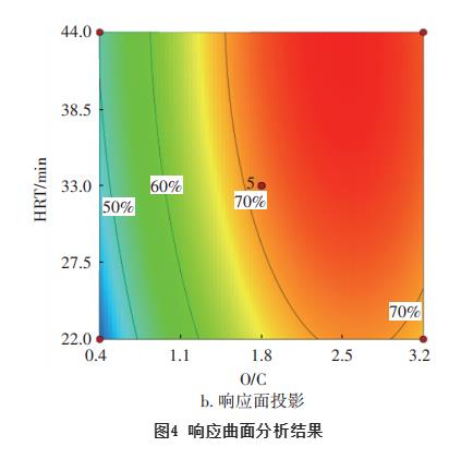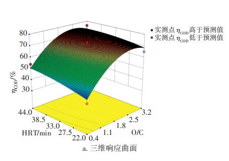 人們往往對(duì)“響應(yīng)面分析”感興趣,因?yàn)槠淠苋娴胤从匙宰兞颗c因變量的關(guān)系。本研究嘗試運(yùn)用設(shè)計(jì)軟件進(jìn)行擬合,采用水力停留時(shí)間HRT、臭氧相對(duì)投加量O/C兩個(gè)主要獨(dú)立自變量,考察ηCOD的響應(yīng)。根據(jù)試驗(yàn)范圍確定方案,每次的運(yùn)行結(jié)果采用內(nèi)插法分析數(shù)據(jù),個(gè)別不在中試范圍的“運(yùn)行”,其數(shù)據(jù)結(jié)果可采用外延法得到,由此得出試驗(yàn)設(shè)計(jì)方案及結(jié)果,見(jiàn)表3。響應(yīng)面分析結(jié)果見(jiàn)圖4。