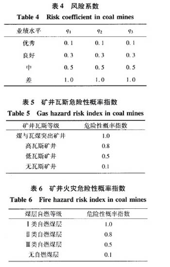 煤礦井下的危險源眾多。由各種危險源導(dǎo)致事故發(fā)生的可能性及后果不同,主要與煤礦管理水平、從業(yè)人員素質(zhì)和技術(shù)裝備水平有關(guān),相互之間的因果關(guān)系復(fù)雜。簡化的風(fēng)險權(quán)系數(shù)計算公式: