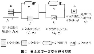 ??? 安全流變?突變的物理模型由4組元件組成(如圖2)。整個系統框架模型分為5個層次:外界廣義作用力區、可立即恢復損傷區、可緩慢恢復損傷區、安全本質損傷區、安全本質損傷加速區,每個層次的反應機理和作用各不相同。事物就是在這種模型下對外界廣義作用力作出相應的反應,最終決定事物是處于安全狀態還是危險狀態的。