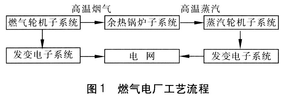 燃氣電廠與一般燃煤電廠主要有兩點不同:在燃煤電廠蒸汽輪機、鍋爐、發電機這3個子系統的基礎上增加了燃氣輪機子系統;與燃煤電廠中鍋爐通過煤料加熱給水不同,燃氣電廠中的鍋爐主要通過燃氣輪機排出的高溫煙氣來加熱給水,從而大大提高發電效率。燃氣電廠工藝流程見圖1。