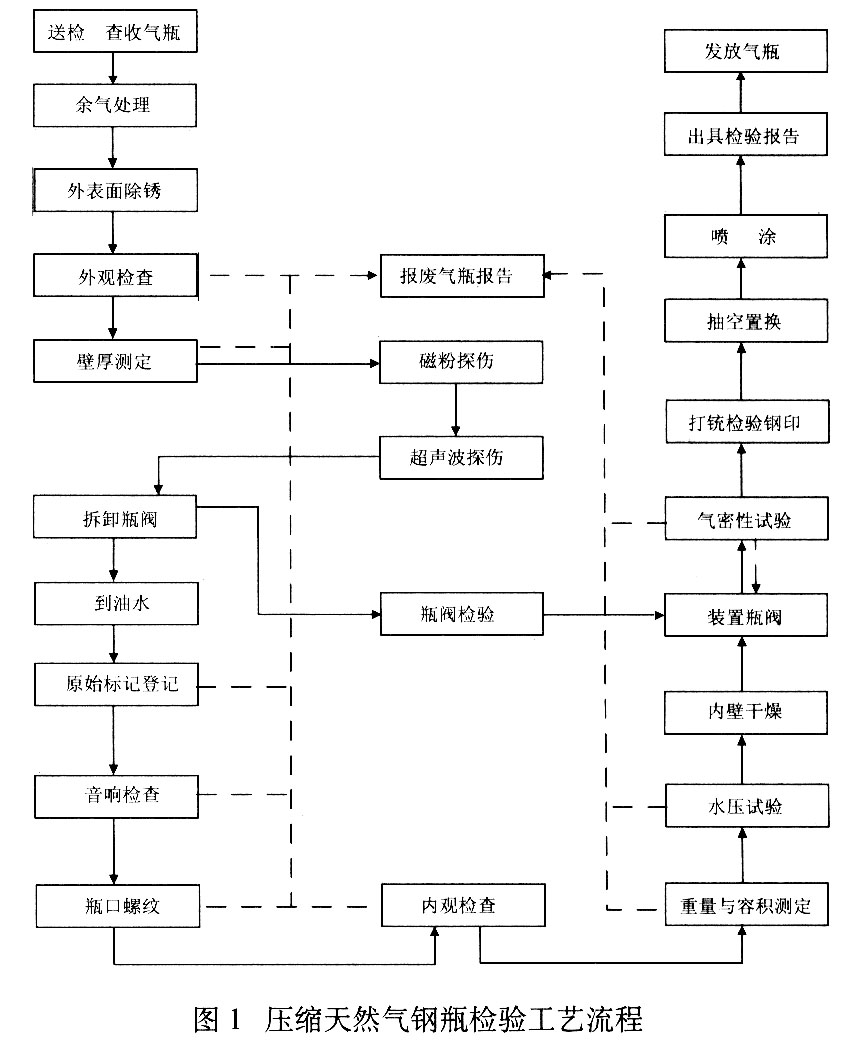 ??? 按照GB19533-2004標準的要求,CNG鋼瓶檢驗的工藝流程見圖1。