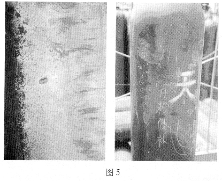 ??? ① 鋼瓶固定處表面損傷,原因是安裝用鋼帶和緊固螺栓使用不當與鋼瓶長期摩擦所致。