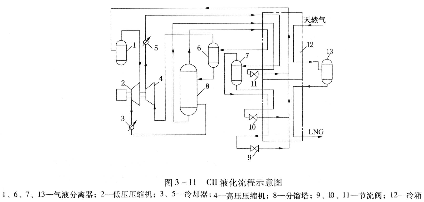 上海建造的我國(guó)第一座調(diào)峰型天然氣液化裝置采用了CII液化流程。該流程如圖3-11所示,流程的主要設(shè)備包括混合制冷劑壓縮機(jī)、混合制冷劑分餾設(shè)備和整體式冷箱三部分。整個(gè)液化流程可分為天然氣液化系統(tǒng)和混合制冷劑循環(huán)兩部分。